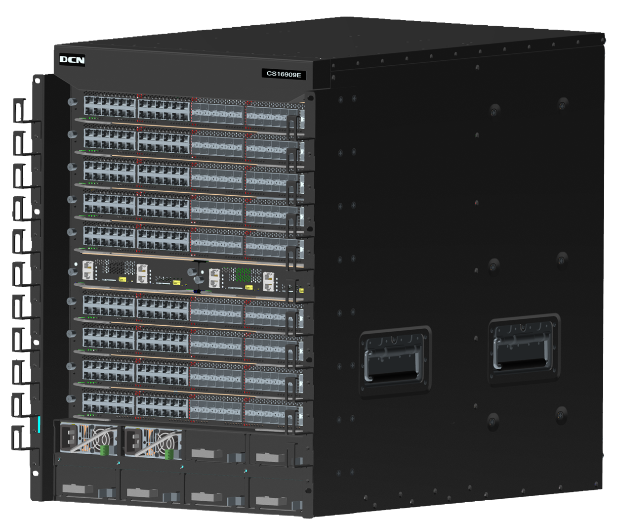 CS16909E CS16909E机箱式路由交换机主机(9个业务插槽,4个交换网板插槽,2个引擎插槽,8个电源插槽),标配4个M16K-FAN风扇(已满配),不含电源模块、管理引擎模块和交换网板模块