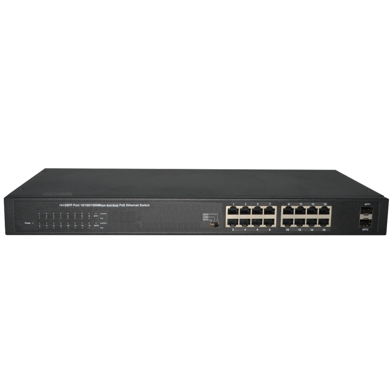 ES1218P-POE是一款全千兆非网管型以太网POE交换机产品,提供16个10/100/1000Mbps自适应RJ45端口(POE+)+2个10/100/1000Mbps自适应RJ45端口+2个100/1000Mbps SFP,最大POE输出240W,持所有端口线速转发。该产品支持手动切换工作模式,可切换为正常模式、端口隔离模式及网络延长模式。采用存储转发技术,结合动态内存分配,确保有效的分配到每一个端口,同时具备流量控制保证节点在传送和接收时,尽可能的避免数据包丢失。
