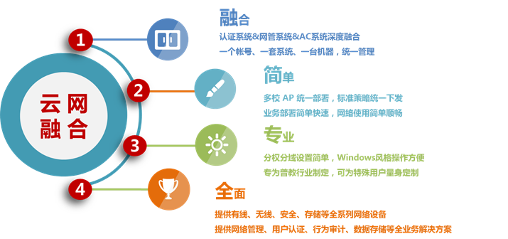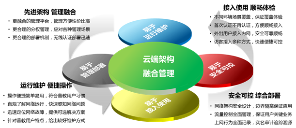 "人 ‧ 网络 深度融合管理”,指智能云管理平台能够将网络中的用户认证管理、用户权限管理、网络设备管理、无线AP管理等统一起来,深度融合,并能够作为后期业务应用的平台,还可以为其它应用给予相关的标准接口。